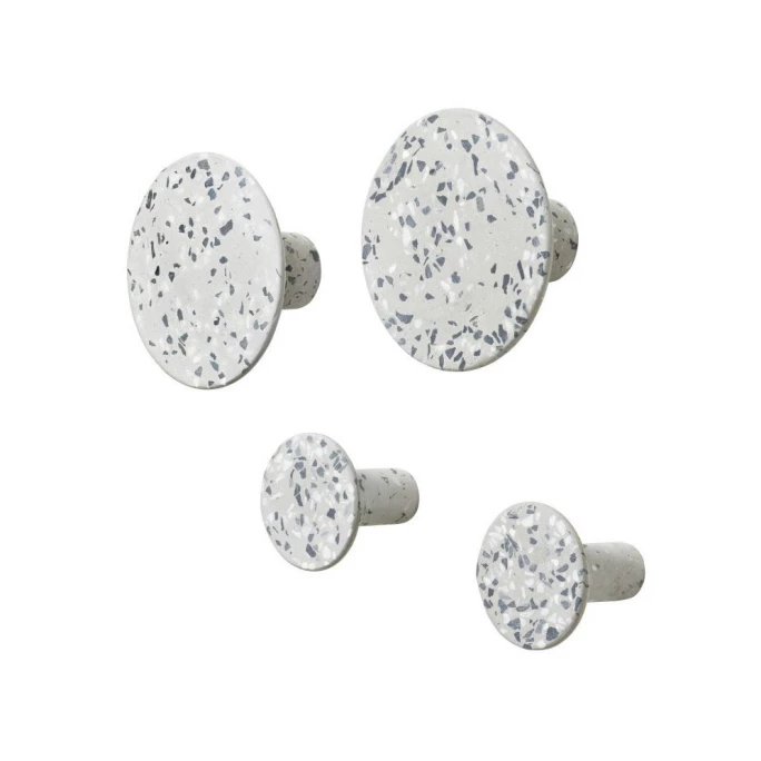 Wandschmuck mit Funktion: Die Wandhaken PONTO in der Farbe Terrazzo grey kommen als 4er-Set in zwei verschiedenen Größen daher. Für den Flur, die Küche oder das Bad – die Haken aus Polystone sorgen stilvoll für Ordnung und lassen sich nach Lust und Laune kombinieren. Ob Handtücher, Jacken, Taschen oder für Geschirrtücher, PONTO bewahrt viele Dinge stilbewusst für Sie auf. Die kleinen farbigen Pigmente im Design unterstreichen das moderne Design, lassen Sie sich überraschen!