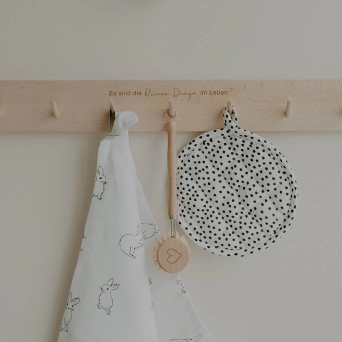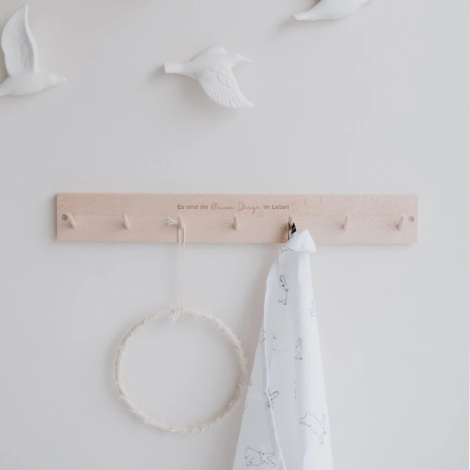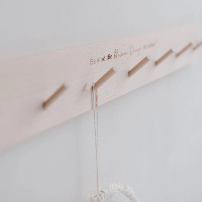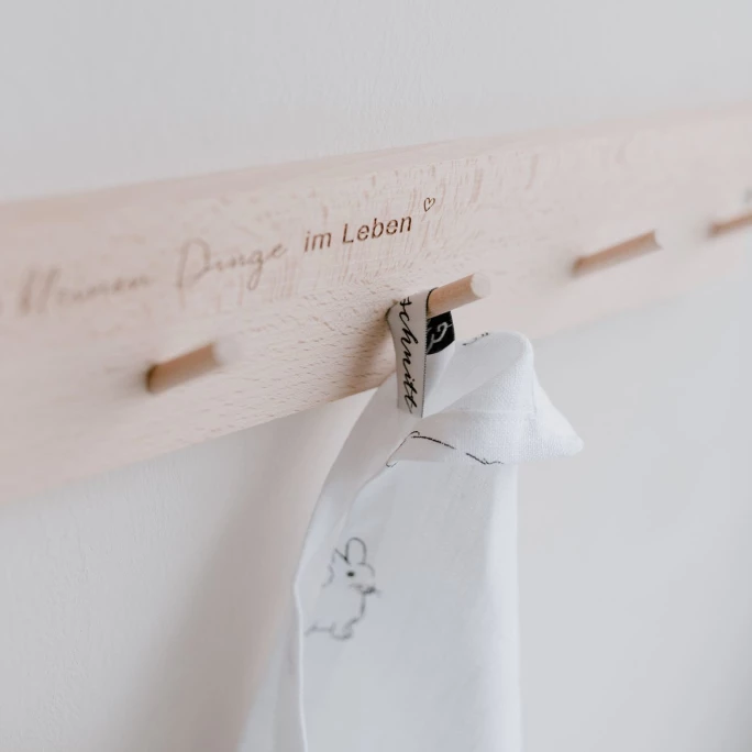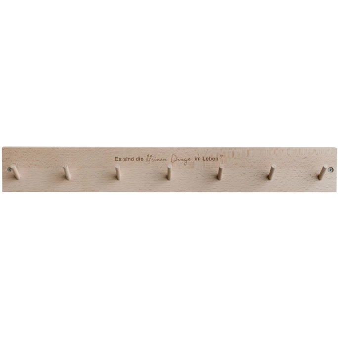 Die geschmackvolle Hakenleiste Kleine Dinge von Eulenschnitt überzeugt durch Funktionalität und Design. Sie ist aus hochwertigem Buchenholz gefertigt und dann veredelt worden. Die Leiste ist mit 7 praktischen Aufhängehaken ausgestattet und mit einem eingefrästen Spruch liebevoll verziert. Sie kann z. B. im Kinderzimmer, in der Küche, im Flur oder im Badezimmer verwendet werden und dort für einen dekorativen Blickfang sorgen. Durch die zwei vorgebohrten Löcher, kann die Hakenleiste ganz einfach mit Schrauben und Dübeln befestigt werden. Diese sind nicht im Lieferumfang mit enthalten. Bitte reiben Sie die Leiste vor dem ersten Gebrauch von allen Seiten mit Öl ein. Diese Behandlung muss in regelmäßigen Abständen wiederholt werden. Sie darf nur mit einem feuchten Tuch abgewaschen werden. Unmittelbar nach der Reinigung bitte gründlich abtrocknen. Vermeiden Sie auch direkte Sonnen- und Hitzeeinstrahlung. Wir bieten Ihnen weitere Wandleisten aus dem Hause Eulenschnitt in unserem AMBIENDO Shop an. Überzeugen Sie sich selbst von der vielseitigen Hakenleiste Kleine Dinge von Eulenschnitt!