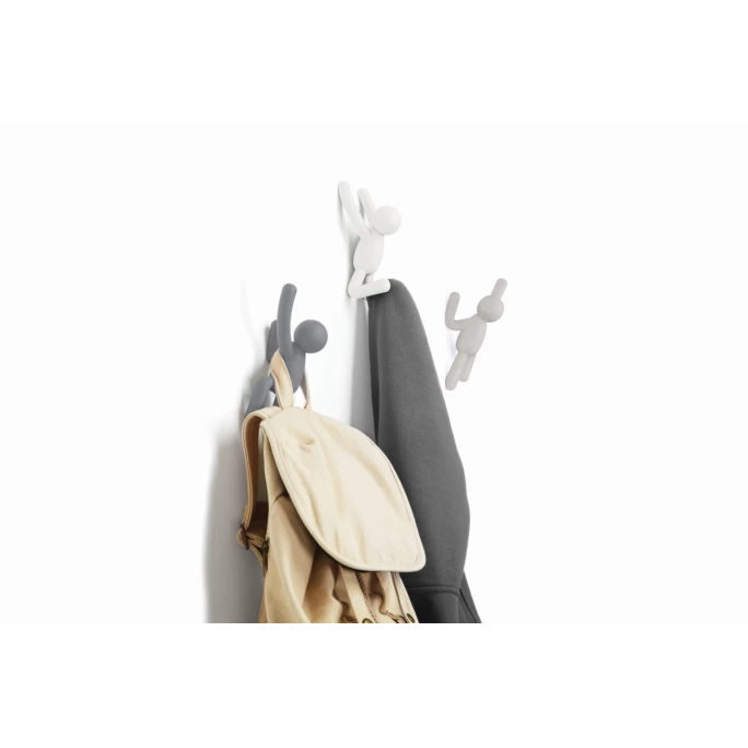 Sie suchen eine verspielte, aber moderne Art und Weise Ihre Mäntel, Jacken und Accessoires ordentlich, organisiert und jederzeit griffbereit aufzubewahren? Dann sind die Buddy Wandhaken von Umbra genau die Richtigen für Sie! Die praktischen Haken bieten Ihnen nicht nur die Möglichkeit Ihre Bekleidung, Accessoires, Bademäntel oder Handtücher sicher und platzsparend aufzuhängen, sondern geben Ihren Wänden zudem einen lustigen Akzent. Aus robustem Kunststoff gefertigt kann jeder einzelne Haken ein Gewicht von bis zu 2,5 kg tragen und ist durch das widerstandsfähige Material auch für Räume mit erhöhter Luftfeuchtigkeit geeignet. Lassen Sie die kleinen, lustigen Figuren als Wanddekoration mit WOW-Effekt Ihre Wände emporsteigen und machen sich die Köpfe, Arme und Beine zunutze, um sie im Handumdrehen in eine stylische und praktische Wandaufhängung umzufunktionieren. Mit dem Umbra Wandhaken-Set Buddy erhalten Sie drei unterschiedlich farbige Haken die mit dem beiliegenden Montageset und der Schritt-für-Schritt-Anleitung kinderleicht an der Wand montiert werden können. Bestellen Sie jetzt und geben Ihren Wänden einen verspielten, einzigartigen und zugleich nützlichen Touch!