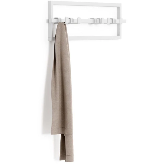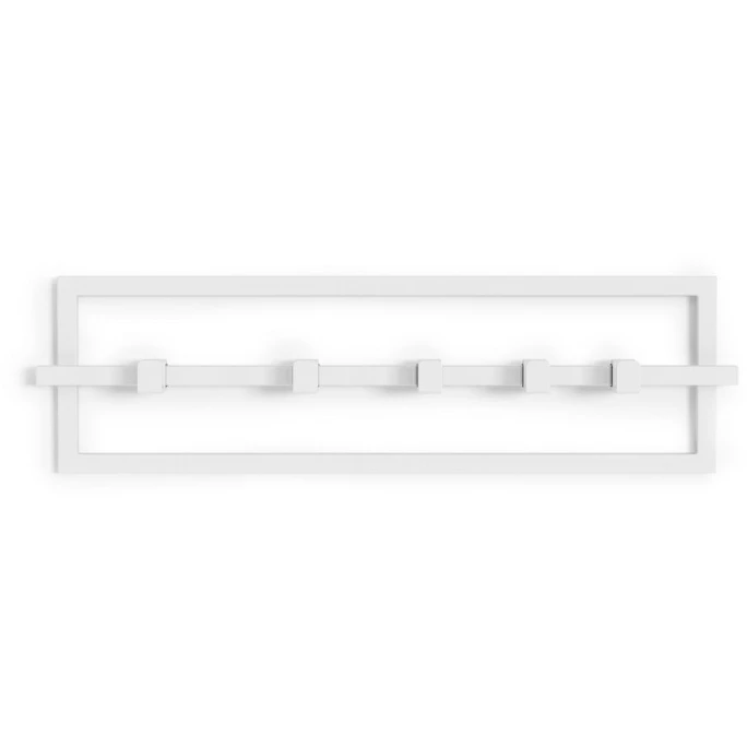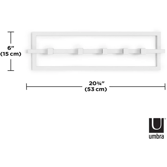 Der schlichte Stil des Umbra Cubiko Wandregal hält Ihren Eingangsbereich daheim ordentlich. Die fünf dazugehörigen Wandhaken sind beweglich und rutschfest, ohne sich zu verhaken oder Ihre Kleidung zu beschädigen. Dabei hält jeder Haken einem Gewicht von 2,3 Kilogramm stand. Der aus Metall gefertigte Cubiko Wandorganizer von Umbra ist ideal für Accessoires, Jacken und Schals und lässt sich überall dort einsetzen, wo Sie für Ordnung sorgen möchten. Das nötige Montagezubehör ist im Lieferumfang enthalten. Umbra ist ein international operierendes Designunternehmen, das für originelle, moderne, coole, funktionale und bezahlbare Produkte für Wohnen & Leben bekannt ist. Aufgrund der hochwertigen Verarbeitung in Hinblick auf die Qualität der Produkte, gewährt Umbra mit gutem Gewissen eine 5-jährige Hersteller-Garantie. Hängen Sie doch zukünftig Ihre Kleidung an die Umbra Cubiko Wandgarderobe.