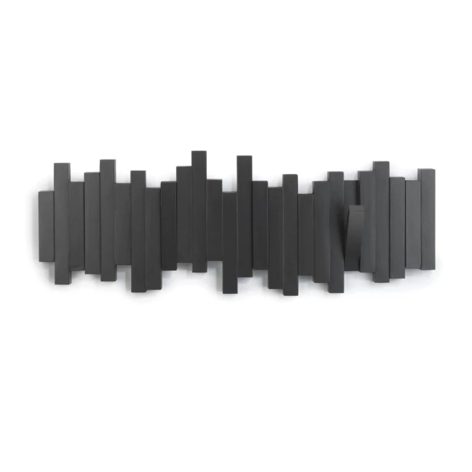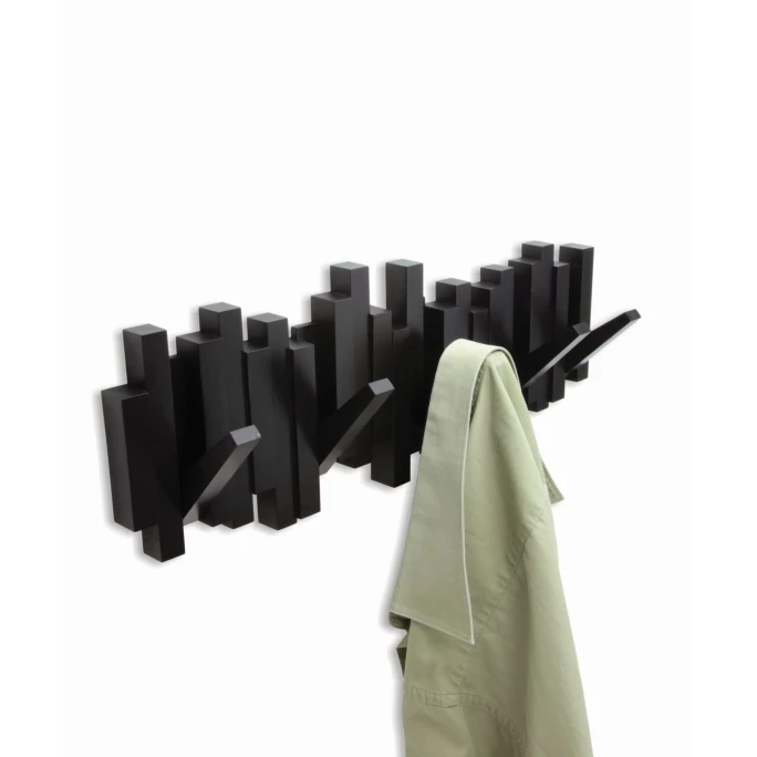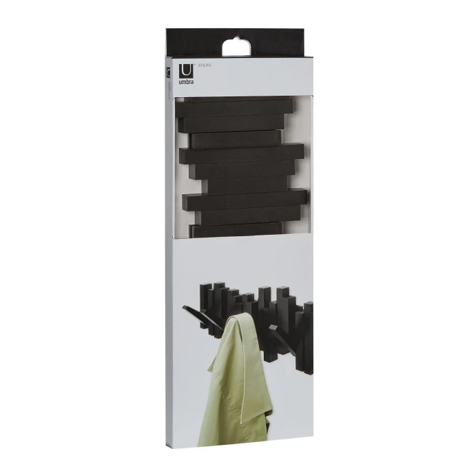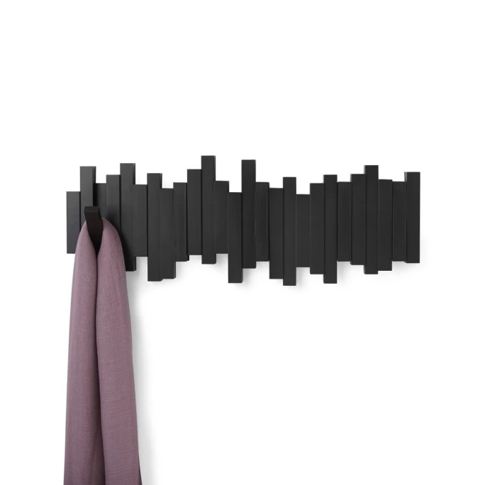 Garderobe und Dekorationsobjekt zu gleich! Die Garderobenleiste Stäbchen aus dem Hause Umbra besteht aus vielen Holzleisten, welche in verschiedenen Höhen eng aneinander geklebt wurden. Dadruch entsteht ein moderner Look, der auch als Wanddekoration verstanden werden kann. Einige der Holzleisten lassen sich herunterklappen, sodass Sie daran Jacken, Mäntel und Accessoires aufhängen können. Material zur Montage der Garderobe an der Wand ist bereits in der Lieferung enthalten. Bestellen Sie die moderne Garderobenleiste Stäbchen von Umbra und lassen Sie sich von Qualität und Design begeistern!